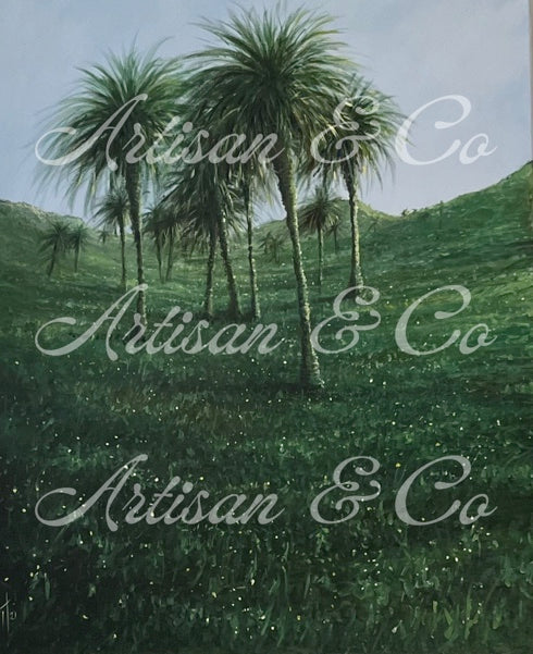 A quiet reverie in oil, Las Palmeras captures a rare moment of verdant renewal on the volcanic island of Lanzarote. Painted in the stillness following spring rain, this serene landscape preserves the fleeting lushness of groundcover and palms before the sun reclaims the terrain. It is a landscape held between memory and light — a breath before it vanishes.