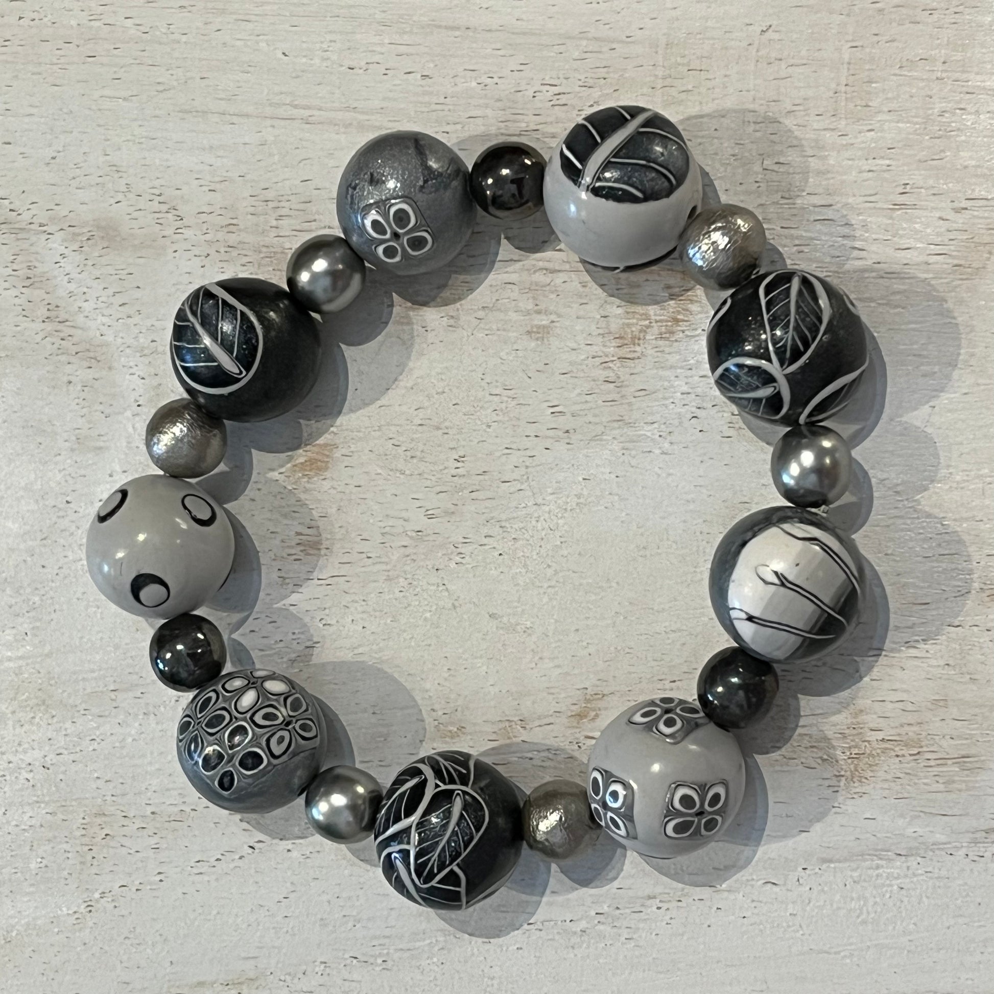 Materials: Polymer clay, super strong elastic transparent cord, glass pearls
