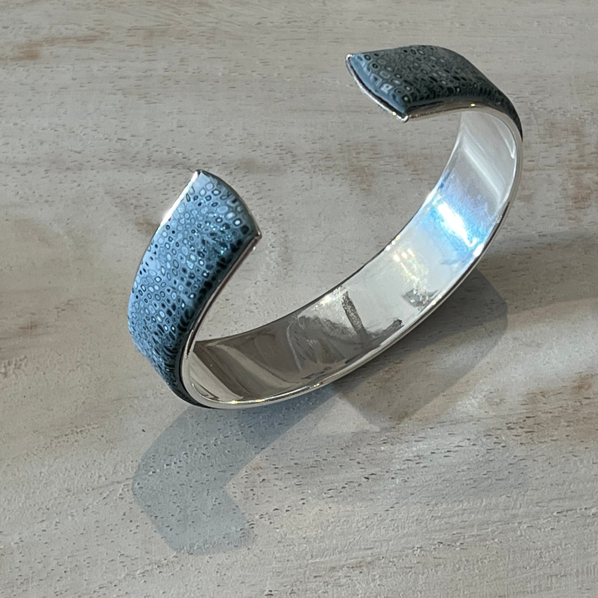 The Sea Foam mosaic cuff is a handcrafted composition, inspired by the reflective shimmer of moody ocean waters and the layered cellular structures found in nature. Each cuff is individually made by layering slices of original handmade polymer clay canes, creating a fluid, organic pattern that is both intricate and quietly bold.